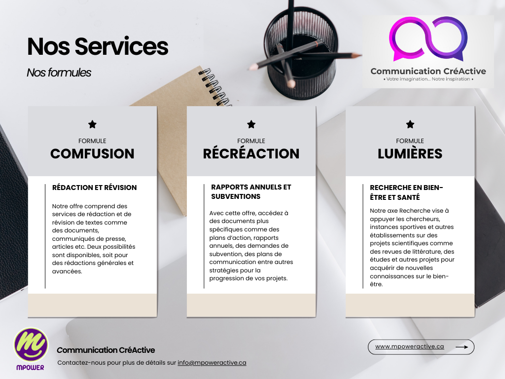 Nous proposons des services de rédaction, stratégie de communication, des solutions personnalisées comme des communiqués de presse, plans d'action, rapports annuels, et demandes de subvention. Chaque projet est traité avec une approche pour libérer votre créativité et atteindre vos objectifs.